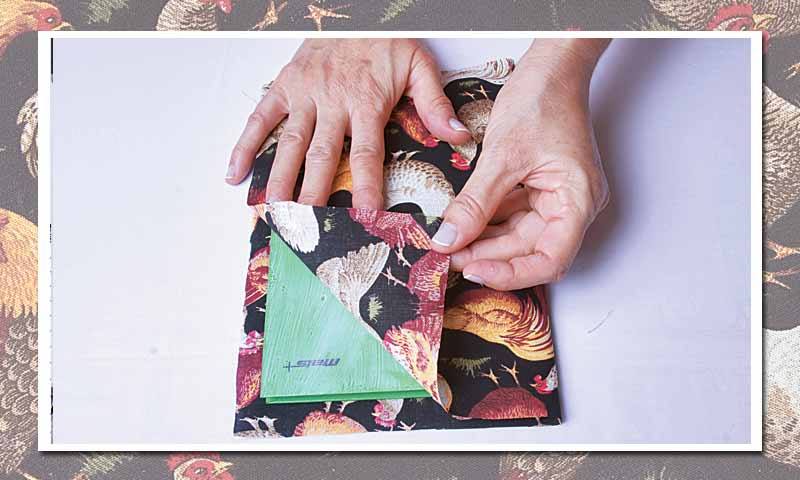 Agora passe a cola nos dois retângulos de papel cartão e fixe nos tecidos. Depois encape-os.