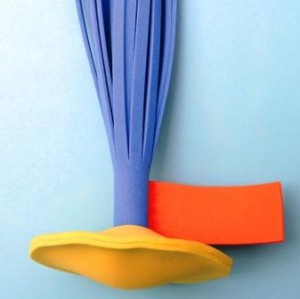 Com um pedaço de EVA em formato retangular, faça tiras de 25 cm de altura, mantendo uma parte sem cortar. Em seguida enrole como na foto abaixo e cole com cola de contato a parte que ficou sem cortar.