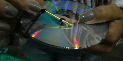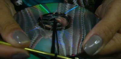 Deixe a parte do CD que reflete para fora. Vá encapando-os, passando as linhas como mostram as imagens.