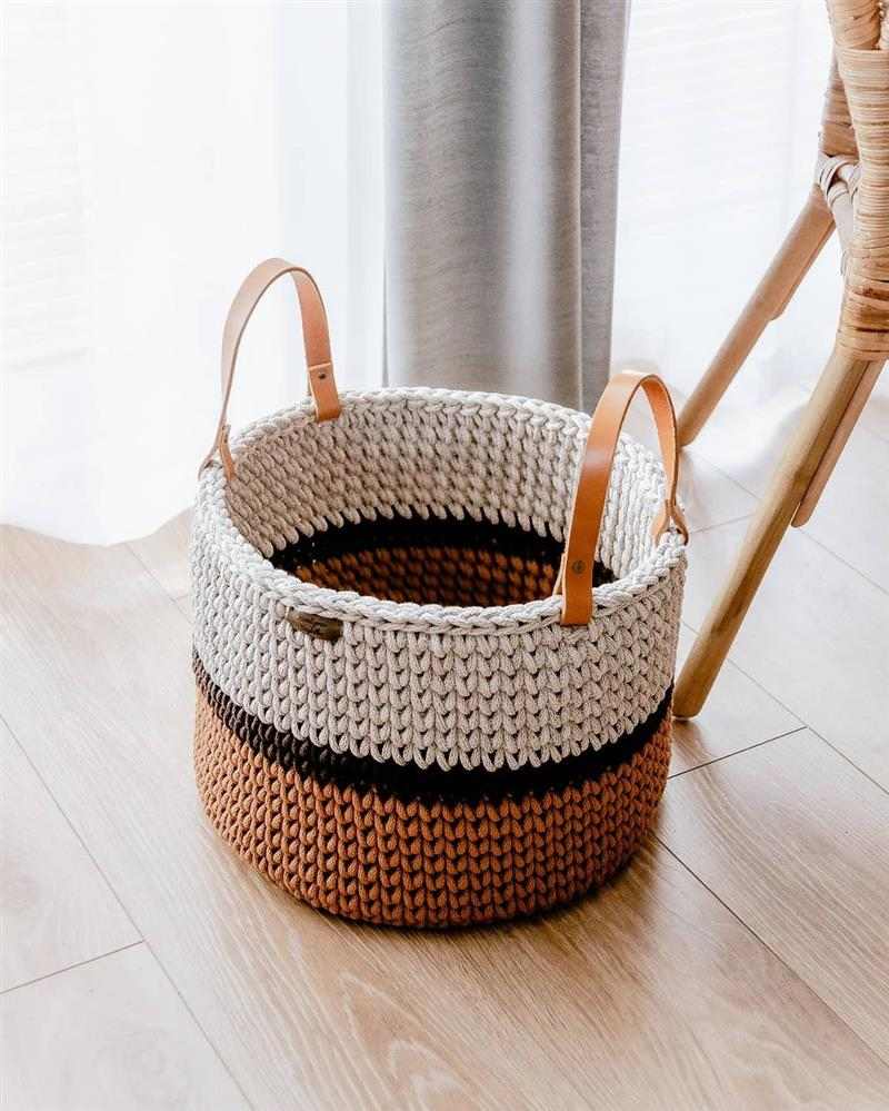 12 – Modelo de cesto de crochê com alça de couro marrom