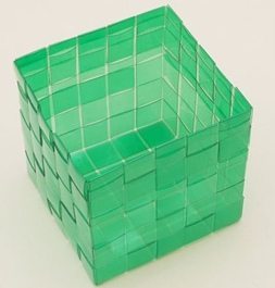 Assim que você for passar a primeira fita dessa segunda etapa, será preciso que você entrelace-a na parte de baixo, com as fitas que já estão fixadas. Para fazer isto, é preciso que você faça uma tecelagem simples, passando a fita uma vez por baixo e depois por cima das fitas já colocadas.  Você deve fazer o mesmo com as demais fitas da segunda etapa. É preciso ficar atenta, pois ao fazer o entrelaçamento, quando a fita anterior passou por baixo da trama, a fita atual deverá passar por cima e vice-versa. O estágio posterior será para a confecção das laterais da caixa. Corte cinco fitas em comprimento necessário para cobrir quatro lados, deixando uma sobra de cerca de 10 cm. Na hora que for entrelaçar a primeira fita, faça com que ela fique desencontrada com a fita paralela a ela no fundo da caixa. Ou seja, quando a fita do fundo passar por baixo da trama, a fita da lateral deverá passar por cima e vice-versa. Comece fazendo a tecelagem da direita para a esquerda, parando a ponta da fita na última posição, de forma que ela fique por cima da trama. Agora você precisa segurar a fita nessa posição, pegar outra extremidade e começar a tecer da esquerda para a direita, avançando para o lado seguinte.