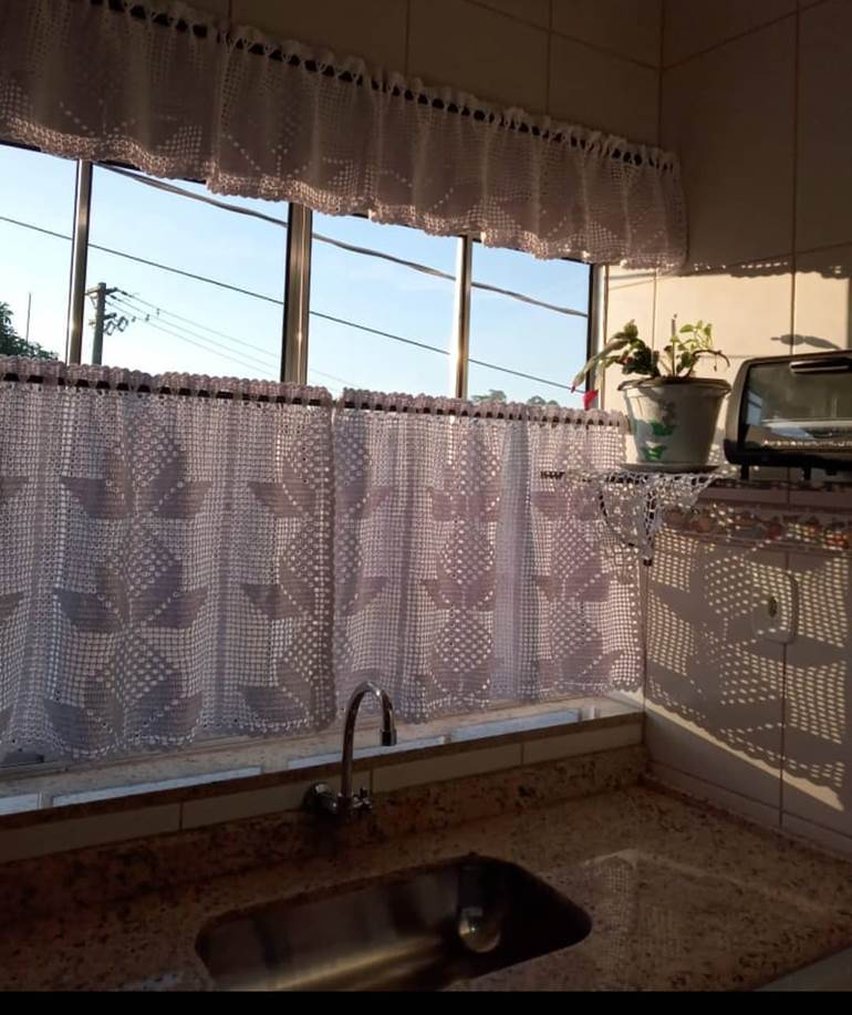Diferente das cortinas para a sala ou para o quarto, a cortina de crochê para a janela da cozinha não fica tão elegante se alcançar o chão.