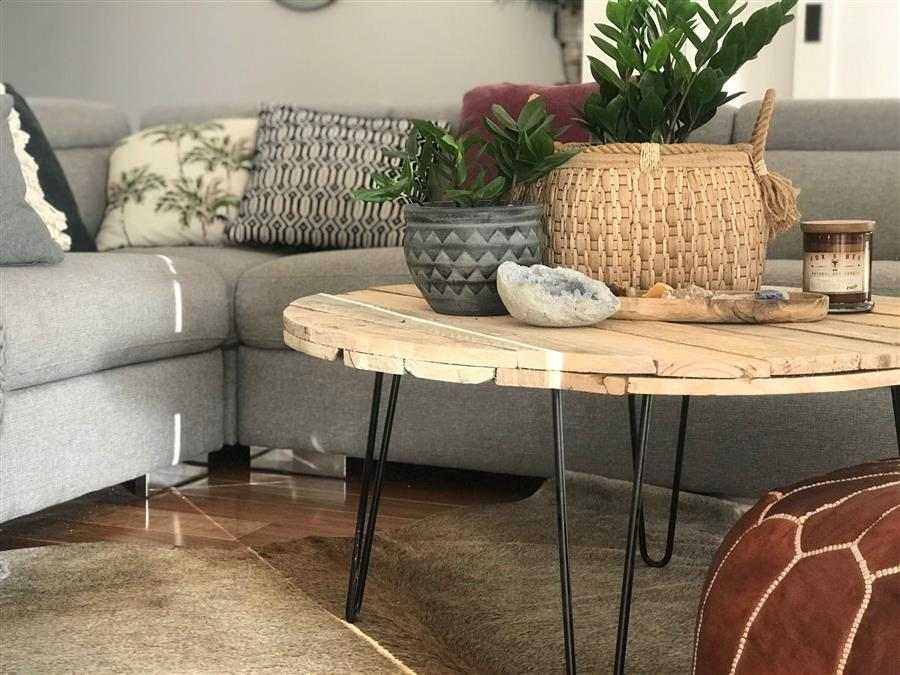 7 – Mesa de centro artesanal de madeira com pés de alumínio