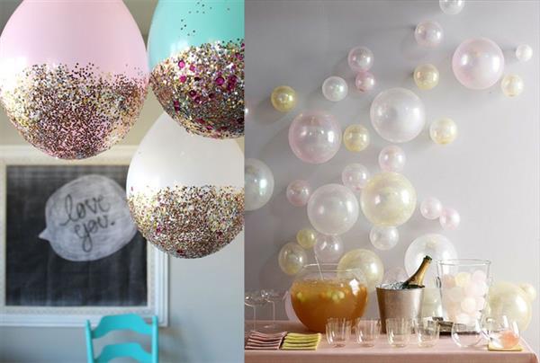 As garrafinhas de vidro podem ser ornamentadas com apliques, barbante, fita de cetim ou tintas de spray para servirem como centro de mesa. Outra ideia bem legal é enfeitar o teto com balões metalizados. Eles irão dar o toque especial que o evento precisa.