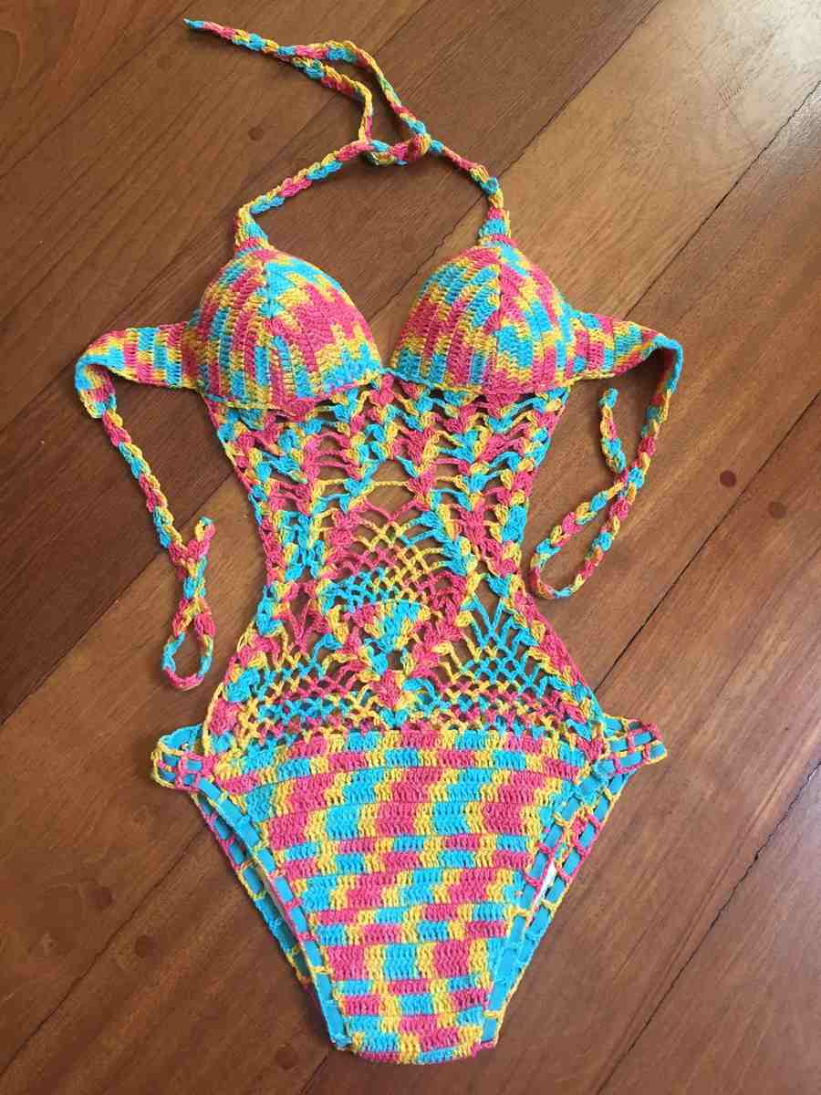 O maiô de crochê costuma usar cores vibrantes e, em geral, com até três cores em uma única peça.