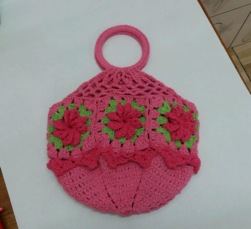 Faça a parte do corpo da peça, também seguindo o gráfico. Quando chegar ao final, já vá fazendo pontos de crochê nas argolas, prendendo-as. Para finalizar a sua peça, faça um bico ao redor da emenda do fundo com o corpo da peça. E está pronto!