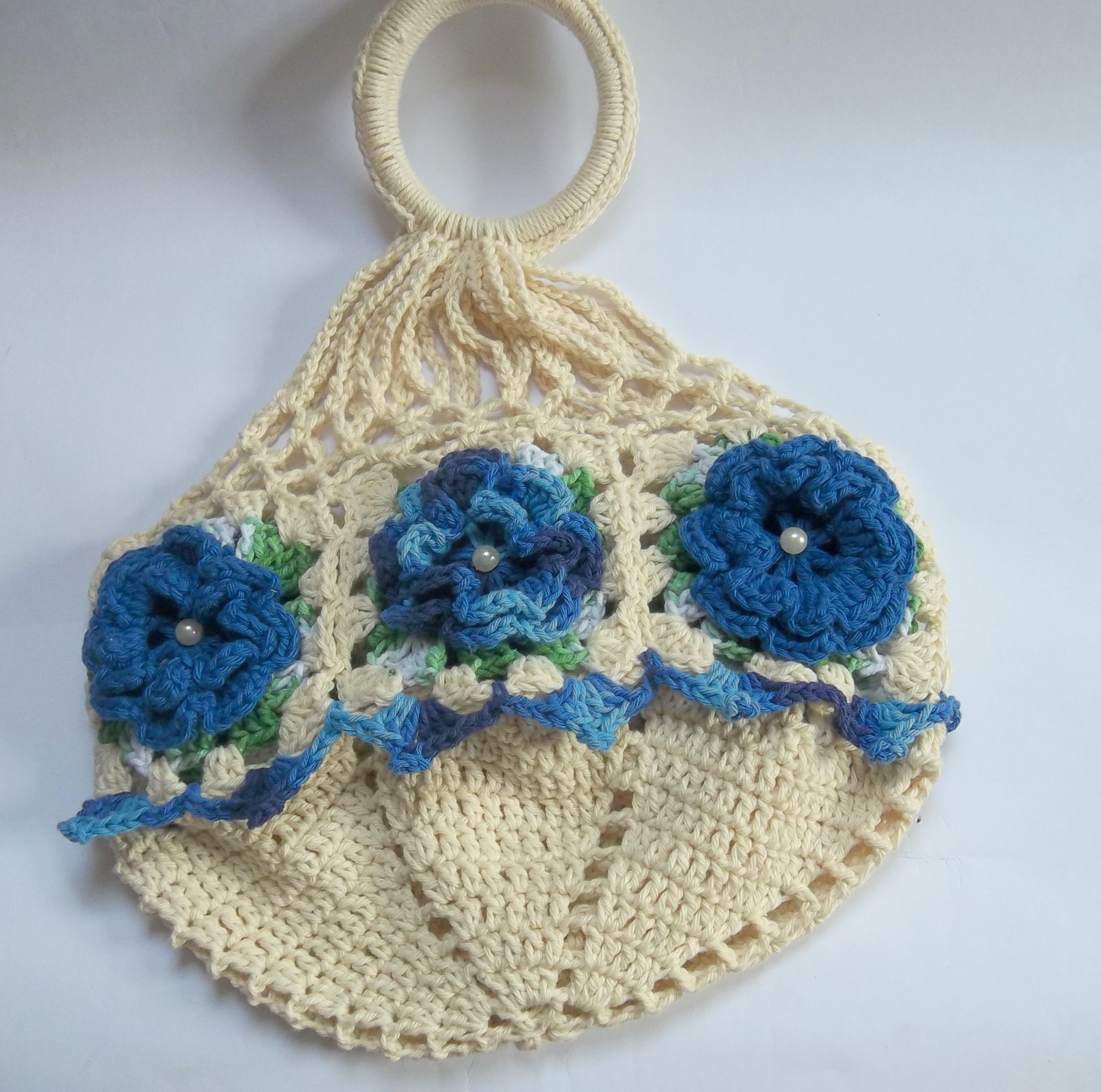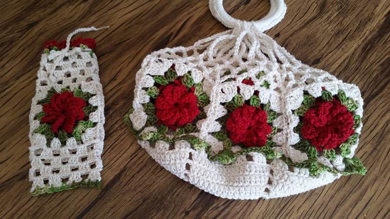Faça as flores de crochê seguindo o gráfico. Costure a uma à outra ou já faça a última carreira de crochê de cada flor unindo já à outra e unindo com o fundo da peça.