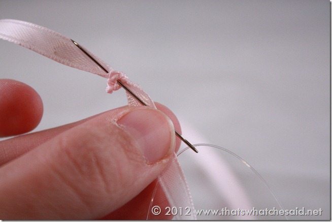 Passe o fio de nylon pela agulha de mão e passe a agulha no meio do nó feito na fita.