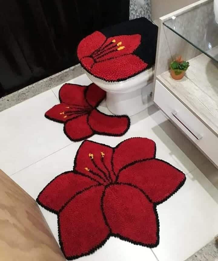 Um conjunto de tapetes para o banheiro precisa ter um tema único, de modo que os tapetes tenham detalhes em comum ou o mesmo desenho principal.