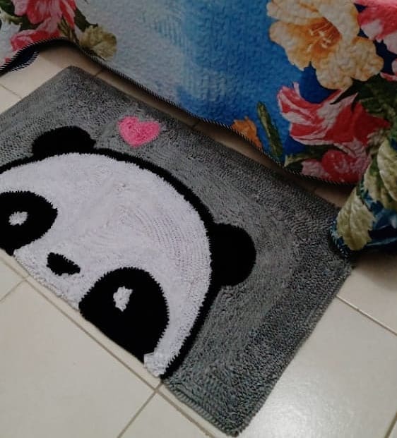 Para além dos desenhos, os tapetes de frufru combinam com esse ambiente porque também enxugam os pés com mais facilidade, já que eles possuem várias tiras de tecido.