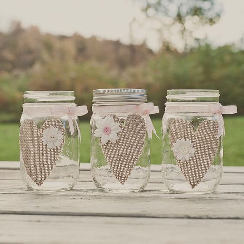 Potes de vidro também podem receber faixa de juta e enfeites diversos.