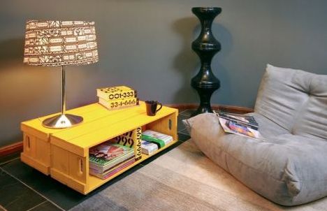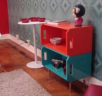 Uma variante da mesinha de centro ou da mesinha de apoio é o criado-mudo que pode ser conseguido com caixotes empilhados, e se você quiser um charme a mais na peça, pinte os caixotes antes de montá-los em formado de criado-mudo e acrescentar as rodinhas ou pés.