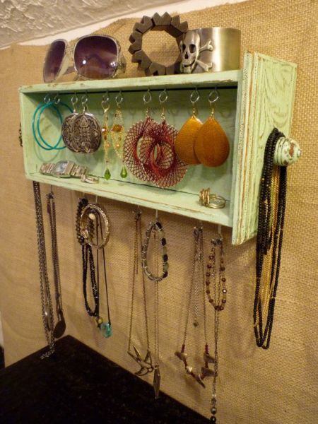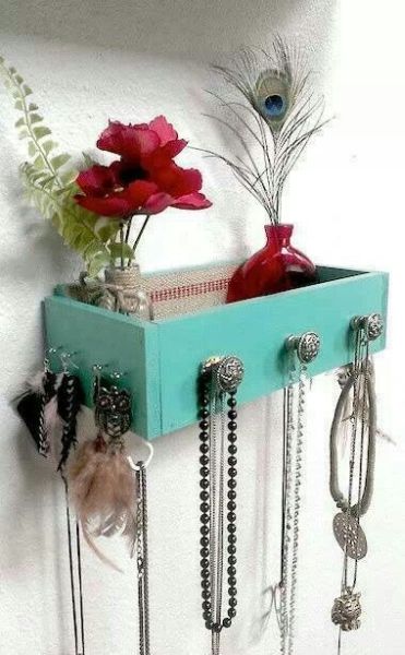 Para organizar as suas bijoux de forma charmosa, diferenciada e barata basta apenas fixar em uma parede uma gaveta de sua preferência (sem a necessidade da gaveta estar customizada ou decorada) e na gaveta fixar alguns ganchos para pendurar as peças e atender as suas necessidades.
