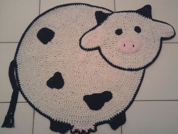 E você pode fazer até mesmo tapetes com formatos de animais e em preto e branco, como os tapetes de vaquinha. E estes tapetes podem perfeitamente ter também alguns detalhes coloridos, como o focinho e orelha da vaquinha, com a cor rosa.