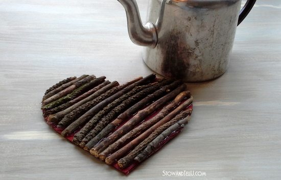 E falando em formato em coração, você pode fazer um lindo e romântico porta-copos em formato de coração e utilizando apenas gravetos (que você pode recolher enquanto faz uma caminhada em algum local arborizado, e por conta disso não custar nada para você, e assim, ser um artesanato bem barato e sustentável) e uma base, que pode ser feita de feltro ou de EVA. E para colar os gravetos em sua base em formato de coração você pode utilizar uma pistola de cola quente ou uma cola resistente de sua preferência.