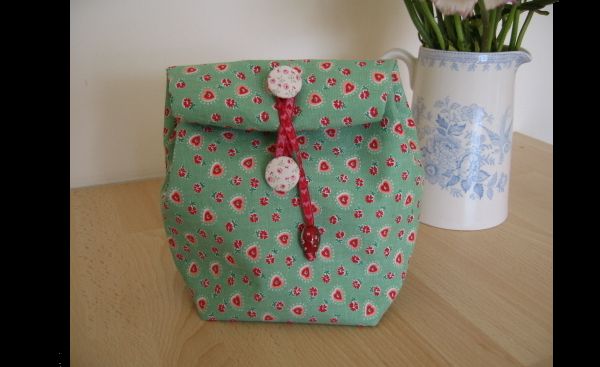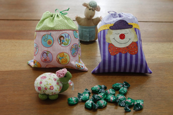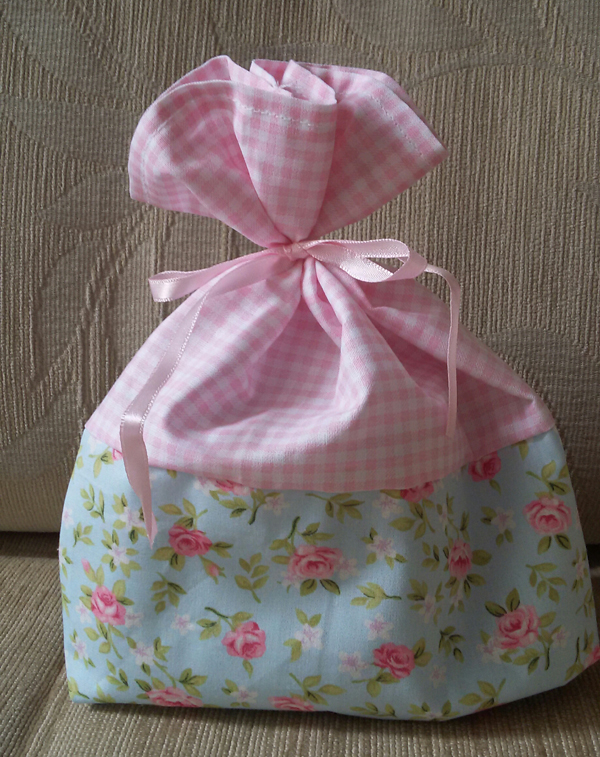 Se você for usar retalhos, costure um pedaço de tecido ao outro. Depois corte dois retângulos no tecido ou nos retalhos de tecido. Posicione uma parte do trabalho sobre a outra, com os lados do direito dos tecidos juntos, para dentro, e costure as duas laterais e o fundo, deixando a parte de cima sem costura. Faça uma barra larga na parte superior e passe a fita ou o cordão, para fechar seu saco. E está pronto!