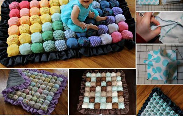 Decida o tamanho que você quer para o seu tapete e corte um tecido com este tamanho, com uma sobra. Corte quadradinhos com tamanho grande, como 15 cm x 15 cm ou com o tamanho que você desejar e corte quadradinhos menores. Posicione o quadrado maior sobre o menor, encaixe os cantos e costure no centro em formato circular, mas deixando a sobra para cima e uma abertura. Encha a bolinha e termine de costurar. Faça este processo com todos os quadrinhos que forem necessários para revestir o seu tapete. Costure uma pecinha à outra, até chegar ao tamanho do tapete. Sobre a parte com bolinha posicione o outro tecido, a parte de baixo do tapete, com o direito do tecido para baixo, em contato com as bolinhas, e o babado ao redor, com o babado ficando para dentro. Vire a peça para o direito, coloque a sobra de tecido da abertura para dentro e feche a abertura com uma costura. E está pronto!