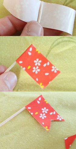 E para deixar os seus petiscos ainda mais apetitosos, faça bandeirinhas para decorá-los. Você irá precisar de: cartolina colorida ou papel de scrapbook; palitos de dentes; cola; e tesoura. Cortar tiras compridas na cartolina colorida ou no papel de scrapbook. Nessas tiras, corte pequenos retângulos do mesmo tamanho. Dobre os retângulos ao meio, encaixe-os no palito bem no local da dobra. Passe cola para fixar as duas partes e recorte as pontas da bandeirinha.