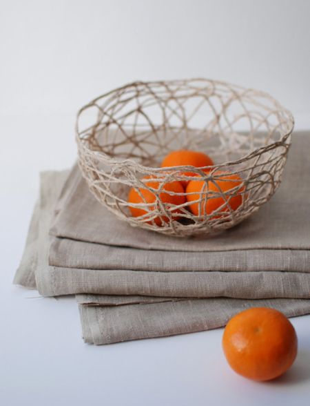 Umedecendo o barbante em uma mistura de cola branca comum com um pouco de água e posicionando sobre uma base, como uma tigela revestida com plástico, e seguindo o formato desta base, você pode criar uma tigela vazada com barbante.