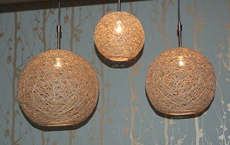E você também pode criar luminárias estilizadas com barbantes. E não faltam modelos de luminárias, podendo ser luminárias de mesa ou suspensas. E você pode utilizar o barbante até mesmo para ser um detalhe em uma luminária estilizada, por exemplo, com você envolvendo a peça, que pode ser um vidro reciclado, com algumas voltas de barbante de depois pintando o vidro, para que quando você retirar o barbante, o local em que ele estava fique transparente e formando um detalhe charmoso na peça.
