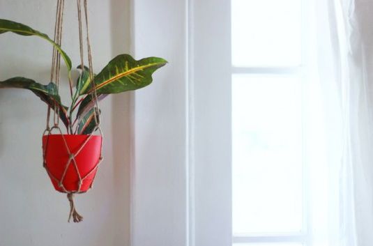 Se você gosta de plantas, mas não tem espaço útil no chão para acomodar um vaso de flores, por exemplo, pode utilizar barbante para criar um suporte para pendurar o seu vaso. Basta fazer nós com estilo de macramê para criar uma base que sustente o seu vaso e depois deixar uma sobra de barbante para pendurar a peça.