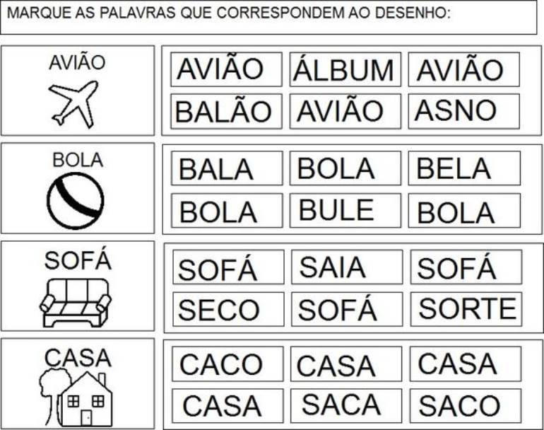 Muito parecida com a atividade anterior, essa tarefa apresenta dois ou mais desenhos associados a uma palavra, sugerindo que apenas o desenho correto seja pintado.