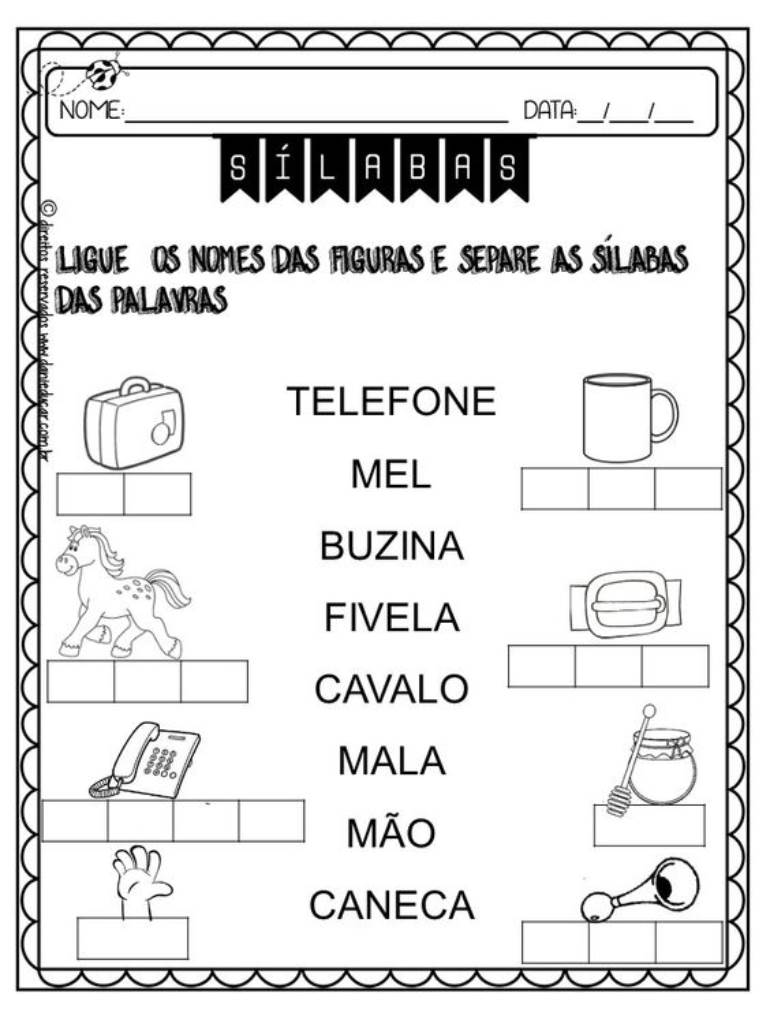 Para aprofundar no ensino-aprendizagem da alfabetização, apresente atividades com palavras simples e ilustradas, orientando as crianças a separarem as sílabas de cada uma delas.