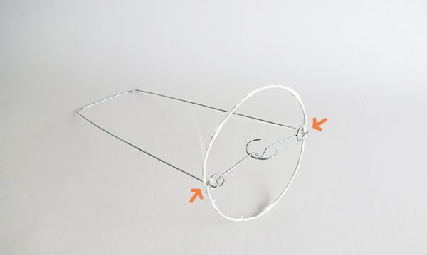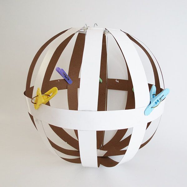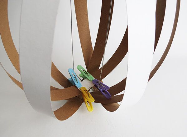 Continuando com a confecção do seu abajur de teto passo a passo, agora você deve começar a colar as tiras de papel ao redor da parte metálica central.