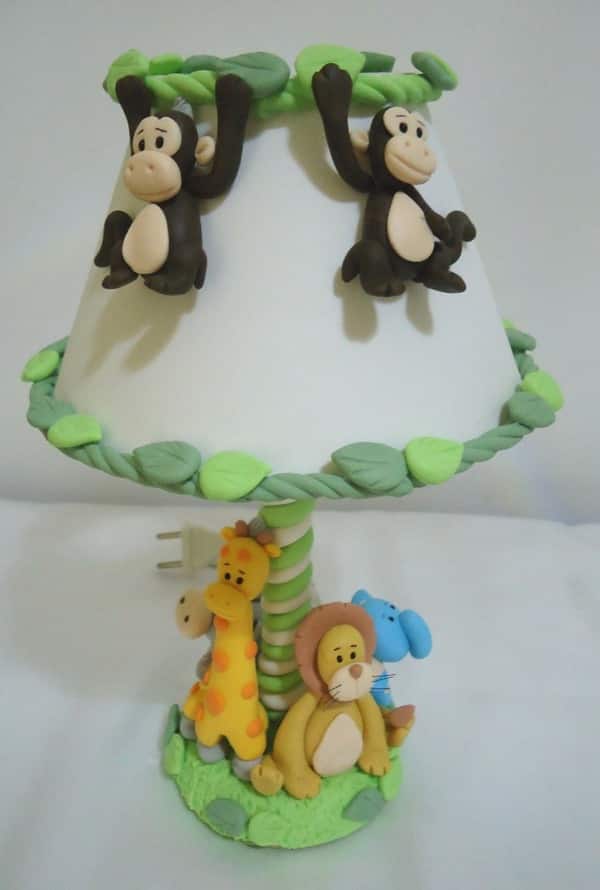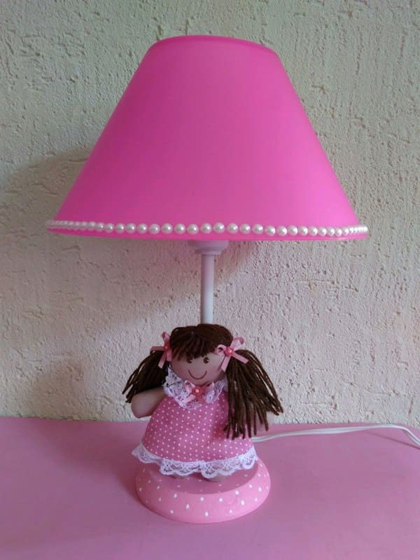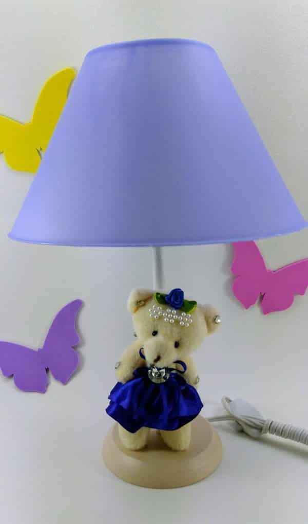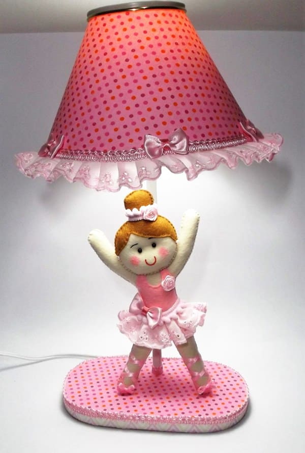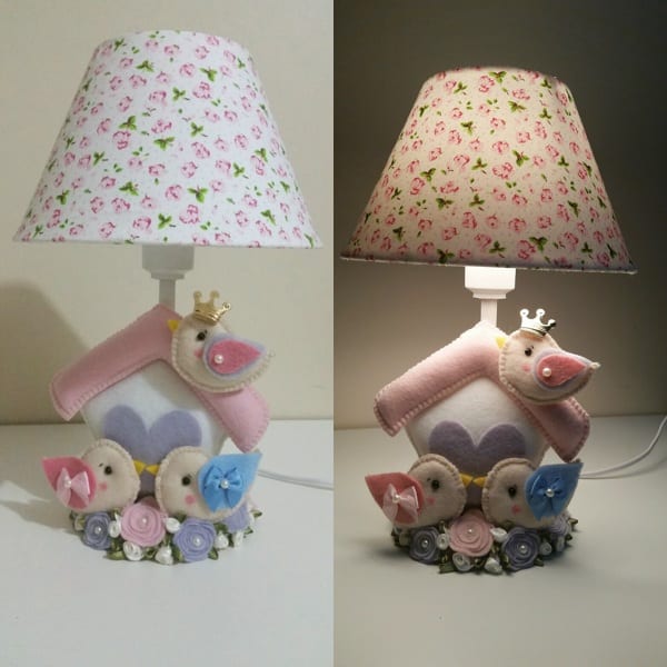 Com feltro, biscuit, pedrarias, tecidos e mais uma infinidade de materiais você pode criar lindos e fofíssimos modelos de abajur para quarto infantil.