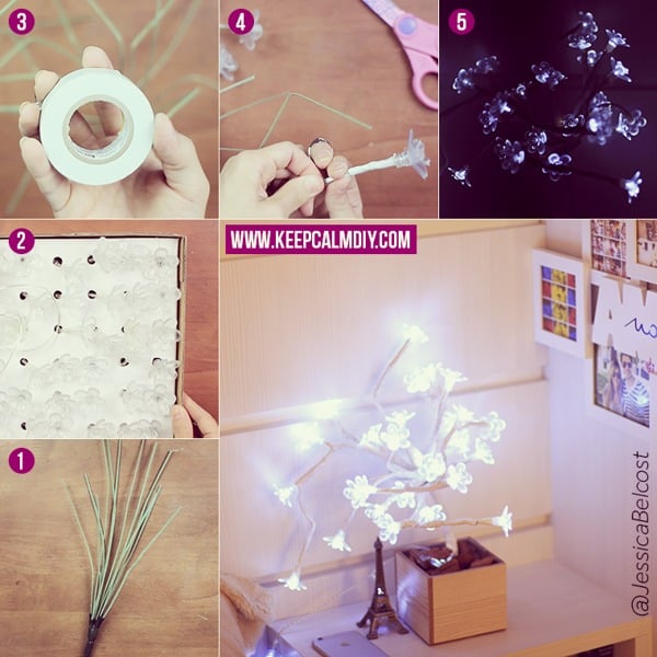 Com pisca-pisca de flores, galhos e um vaso como base, você criar um abajur infantil em formato de árvore iluminada.