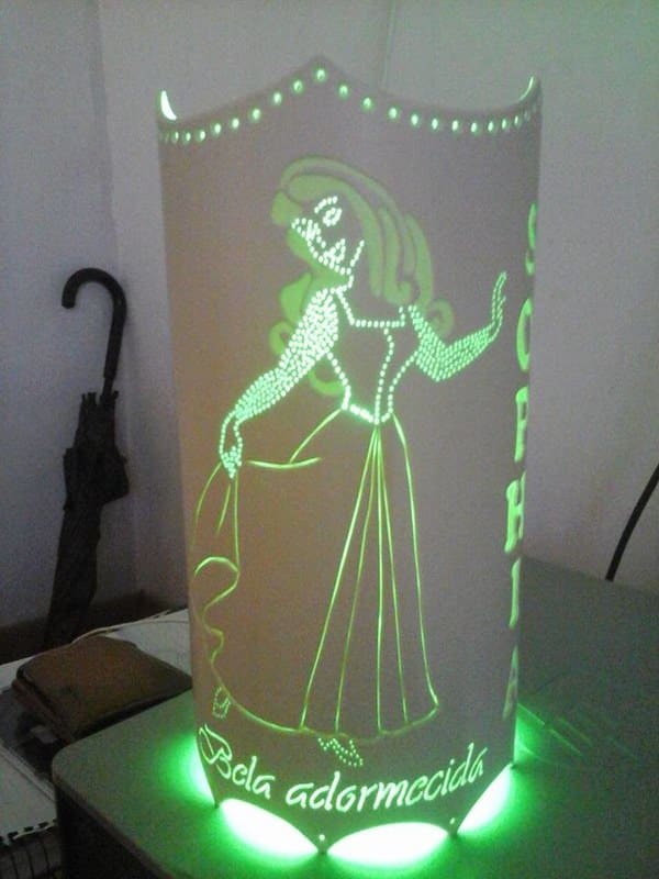 Cortando uma garrafa pet de qualquer tamanho você já possui a base para um abajur. Basta abrir uma aba na base, criando uma porta, colocar uma vela de LED ou soquete com lâmpada pequena e decorar a garrafa como se fosse uma casinha de fada, por exemplo.
