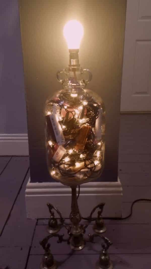 A garrafa de vidro pode ser apenas o suporte do seu abajur artesanal ou ainda acomodar dentro um pisca-pisca, para iluminar ainda mais o seu quarto.