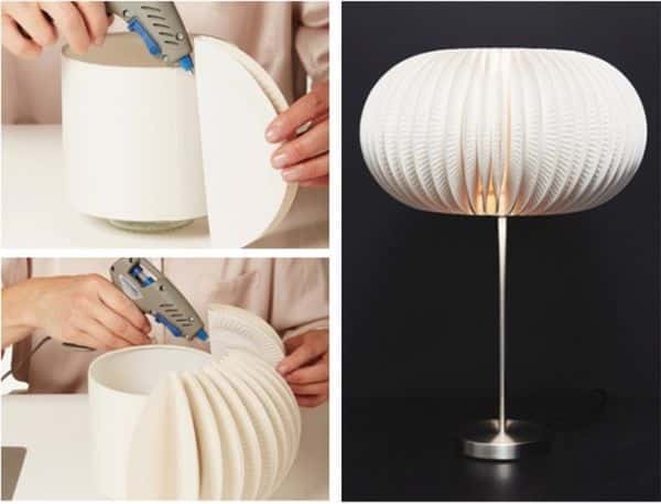 Você pode fazer abajur com apenas pratos de papel. Dobre cada prato e cole-os sobre uma cúpula que também pode ser feita de papel. Use cola quente ou cola tudo. Veja mais exemplos: