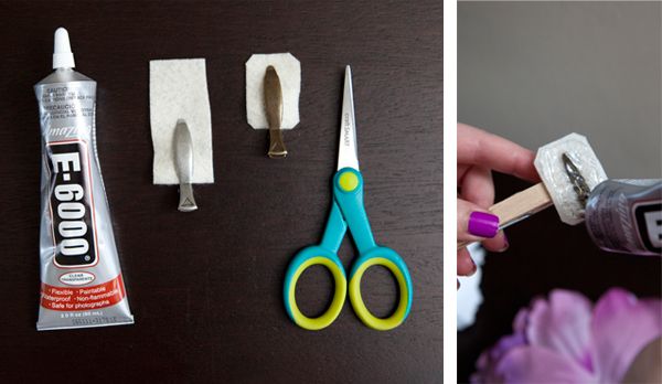 Logo após, corte um pedaço de feltro, faça cortes no centro deste pedaço, para encaixar a presilha escolhida e corte o feltro ao redor da presilha. Depois prenda a presilha em um prendedor para roupas e aplique cola E6000 no feltro com a presilha.
