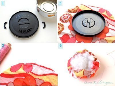 Comece separando todos os materiais que você vai utilizar em seu artesanato. Corte um círculo de tecido com tamanho maior que o tamanho da tampa escolhida. Alinhave a borda e puxe um pouco. Encha a peça com a manta acrílica ou outro enchimento de sua preferência.