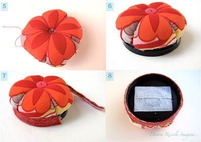 Passe a linha formando “gomos” em sua almofada. Costure um botão no meio da peça. Cole a almofada na tampa e ao redor da tampa cole um pedaço de fita ou da passamanaria que você quiser. Cole velcro na parte de baixo da tampa.