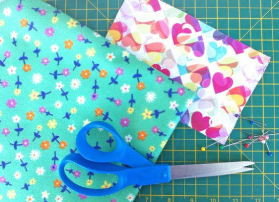 Comece cortando dois retângulos nos tecidos escolhidos e um retângulo menor no retalho de feltro. E estes retângulos podem ter o tamanho de sua preferência.
