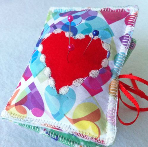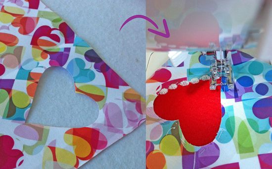Em seguida, transfira o molde de coração para a parte do alfineteiro em que irá ficar na capa, recorte como vazado, posicione um retalho de feltro por baixo e faça um ponto decorativo para unir estas partes.