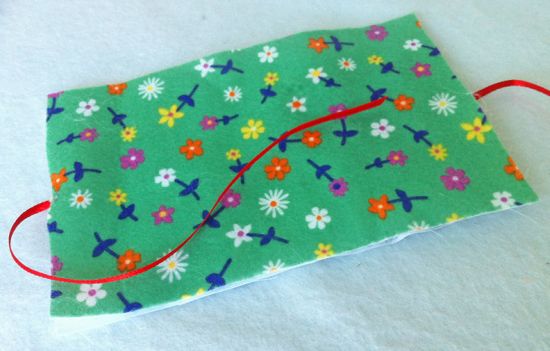 Logo após, costure o tecido com o feltro para forro e com um pedaço de fita nas laterais com o ponto caseado nas bordas. Mas deixe o fundo aberto para virar. Vire e faça um caseado nas bordas, mas mantendo a abertura no fundo.