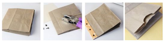 Comece posicionando um saco de papel sobre o outro, na mesma ordem, e dobrando-os ao meio. Com a cartolina que você escolheu para fazer a capa do álbum, corte-a na largura desejada para que se ajuste ao tamanho dos sacos. Deixe um excesso de papel para que possa prender atrás, aonde irão as tarrachinhas. E faça quatro furos na cartolina e nos sacos de papel e passe as tarrachinhas por eles.