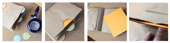 Como as bordas do saco possuem uma meia-lua, deixe-as ainda mais arredondadas (cortando com a tesoura). Em seguida, use as cartolinas restantes, cortando-as no tamanho necessário para que se ajustem dentro dos sacos. E para fazer as abas, corte três círculos e os grampeie nas páginas que não têm o bolso para colocar as fotos, de forma que sobre apenas uma meia lua para fora. Ao final deve ter três páginas com abas e três com bolsos para as fotos.