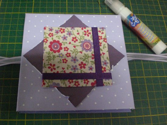 Na capa faça um quadrado com papel de outra cor e desgaste-o com tesoura nos cantos e cole como se fosse um losango. No quadrado de tecido cole duas fitas de gorgorão (use a cola de lantejoula). E enfeite capa como você quiser.