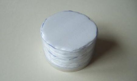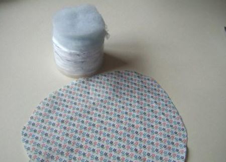 Agora, posicione os círculos de manta acrílica sobre os círculos da bandeja de isopor e corte um círculo grande, com tamanho maior que o tamanho da caixinha, no tecido escolhido.