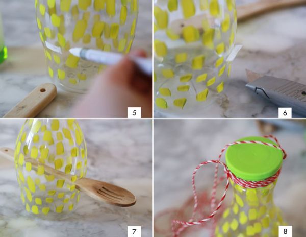 Em seguida, assim que a tinta estiver bem seca, faça duas marcas em sua garrafa, com uma marca de frente para a outra, e corte nestas marcações, com o auxílio do estilete. Depois posicione a colher de pau de forma que a colher passe pelos dois cortes. E então amarre um grande pedaço de cordão ao redor da borda da garrafa de plástico, mas formando também uma grande laçada, para você pendurar a peça ao final.