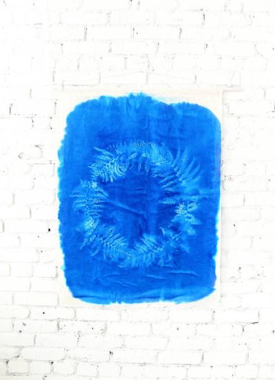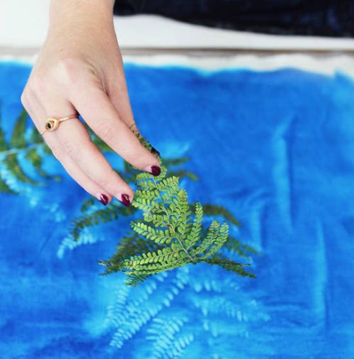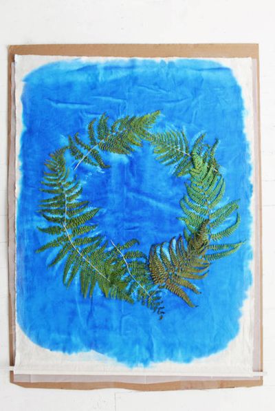 Em seguida, leve o tecido para uma área externa e deixe sob a luz direta do sol (uma lâmpada de calor também funciona). E se estiver ventando, use pedras ou alfinetes para prender a folhagem no lugar. Lembrando que as estampas feitas sob o sol ficam mais atmosféricas (bordas mais borradas e imagens mais desfocadas) enquanto as estampas feitas com a lâmpada de calor ficam mais definidas e gráficas. E deixe o tecido secar muito bem. Isso deve levar em média uma hora, dependendo da época do ano e sua localização.