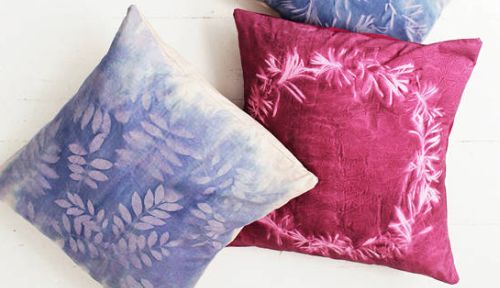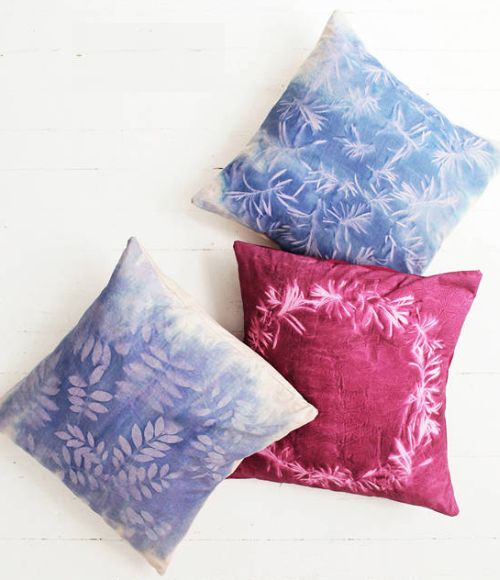 Logo após, remova as folhagens e fixe as cores passando o tecido por 2 a 3 minutos. Com o tecido seco, basta costurar a outra parte da almofada, deixando uma abertura, encher com a manta acrílica e fechar com pontos invisíveis à mão. E está pronto!