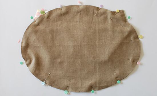Logo após, posicione as orelhas na parte da frente da almofada e prenda-as com o auxílio dos alfinetes para costura.