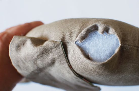 Em seguida, para finalizar a sua peça, passe uma costura reta ao redor de toda a peça, mas começando a costura abaixo de uma das orelhas e deixando uma abertura. Desvire a peça pela abertura deixada, encha com o enchimento escolhido e feche a abertura com pontos invisíveis à mão. E está pronto!