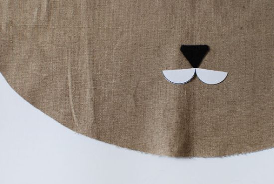 Em seguida, posicione o focinho da cachorro e a boca em uma das partes da cabeça, para você montar a carinha da cachorro. Marque todas estas partes no lugar e cole o focinho, com o auxílio da cola para tecido, e borde a boca, formando a parte de baixo da carinha da cachorro.