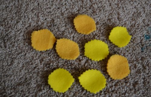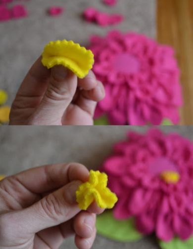Agora, faça o centro da flor. Para isso, corte vários círculos no feltro amarelo ou com a cor de sua preferência, com a tesoura comum ou para picotar. Dobre os círculos ao meio e dobre novamente de forma estilizada.